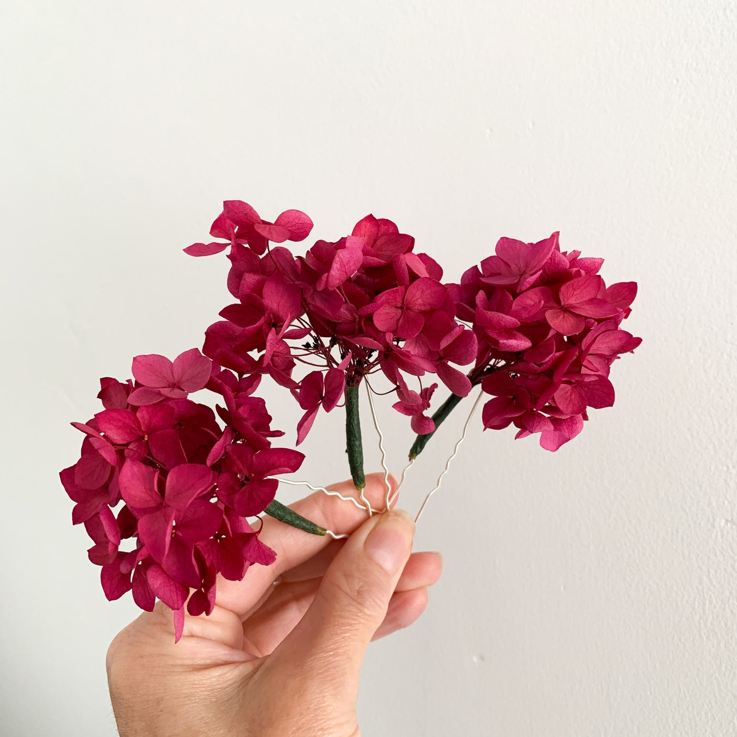 Preserved hydrangea in cherry red set upon silver tone hair pins. Packed full of hydrangea petals, this hair pin can be used on it's own or you could group a few together for an even fuller look.