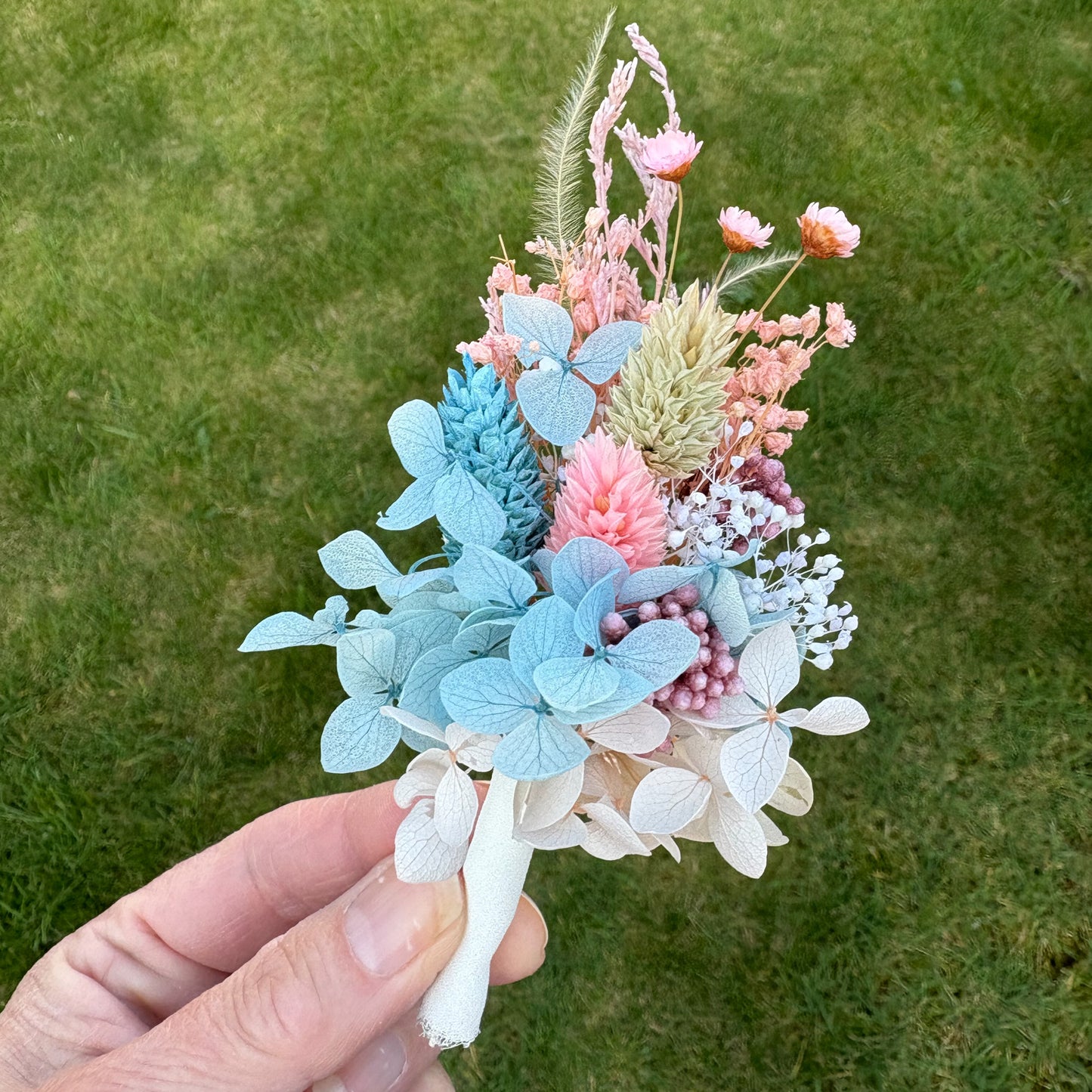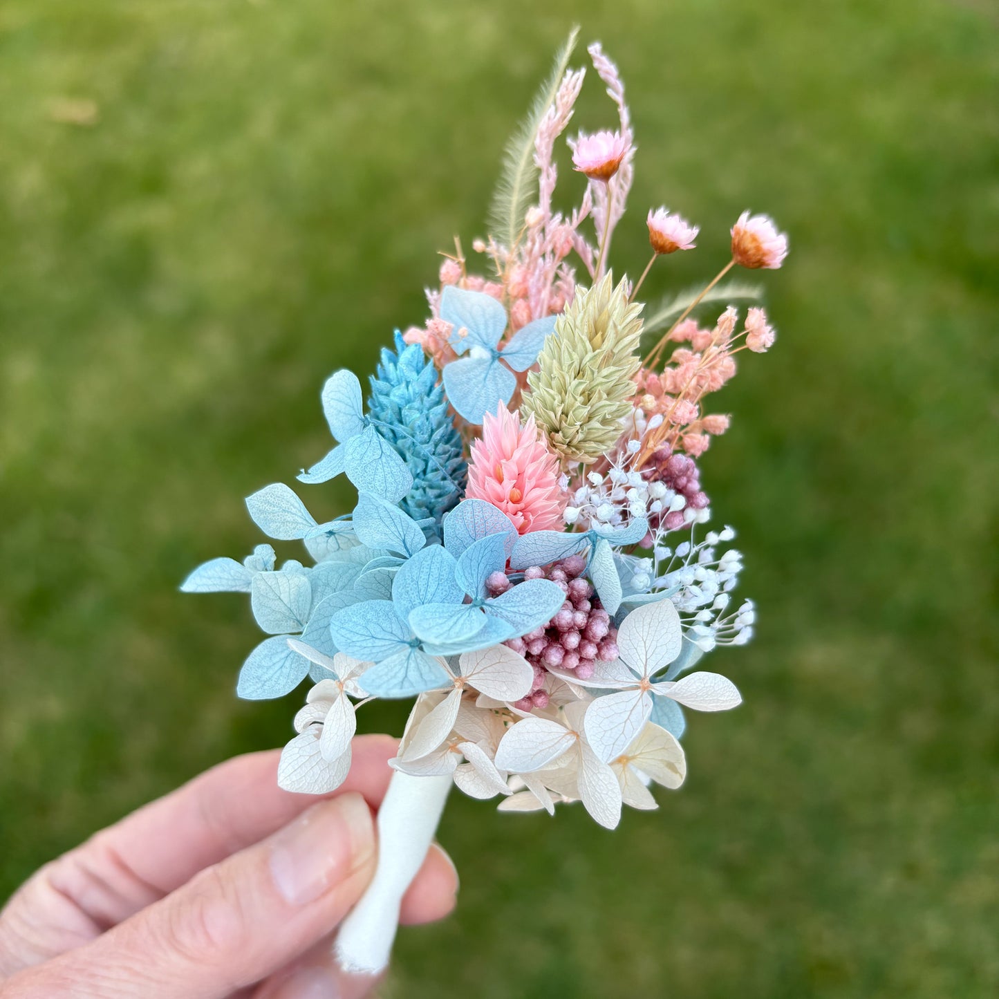 Our dried flower buttonholes bring style to the groom and his party. Made to match your bridal bouquet, these buttonholes add a touch of charm without the worry of wilting. Order in advance and have them ready to go, lasting keepsakes that look perfect on the day and beyond.