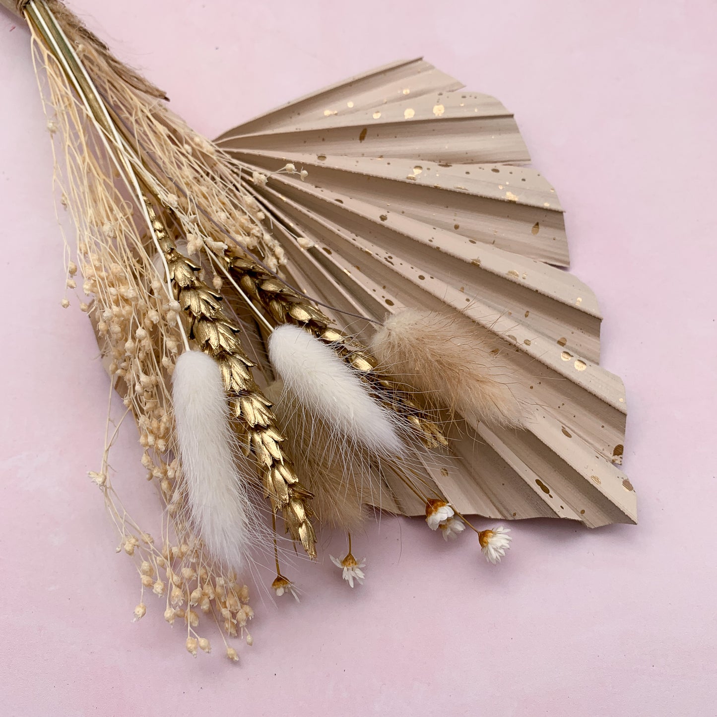 The bunch contains 1 x painted palm spear in almond with gold speckles and an assortment of gold and natural dried grasses including bunny tails.