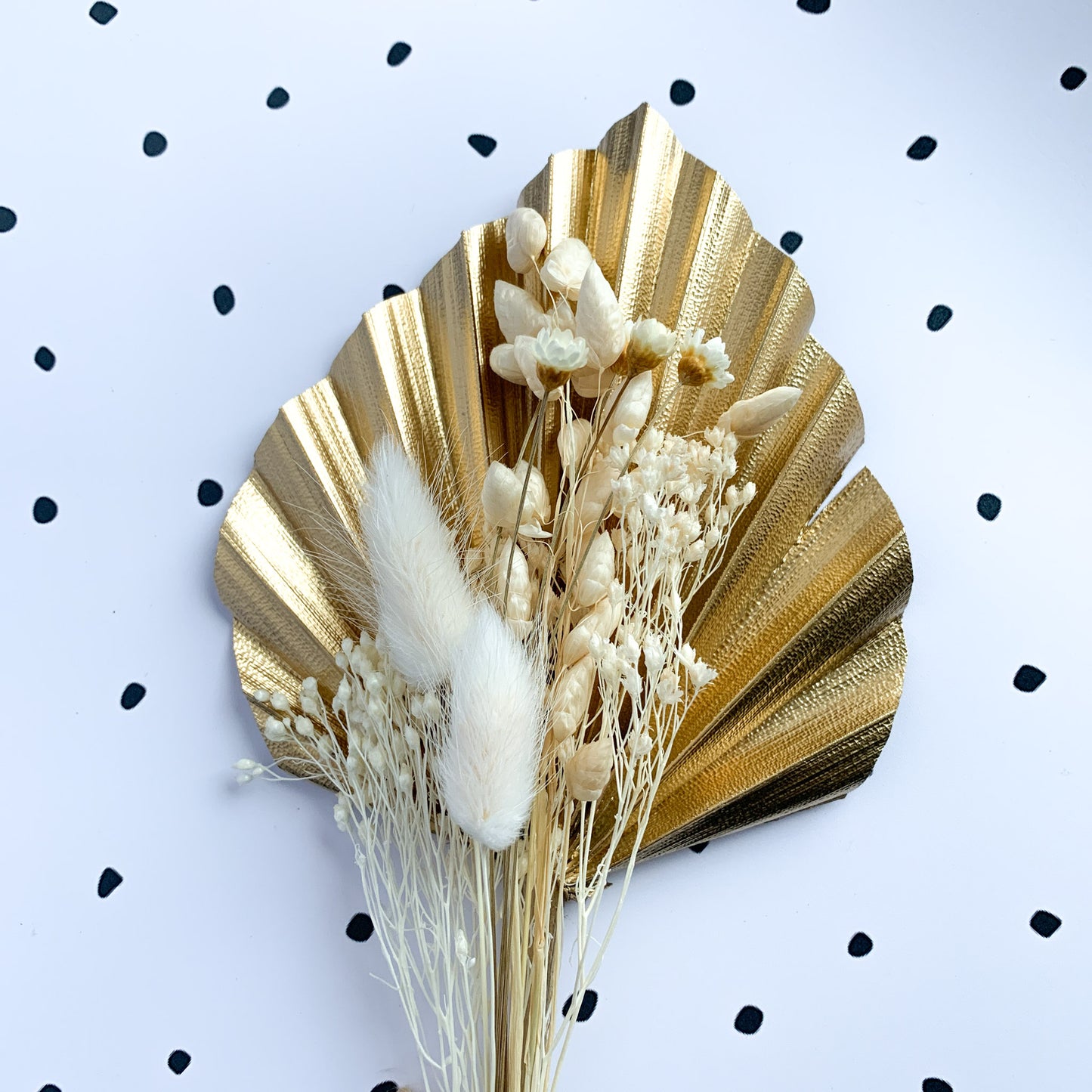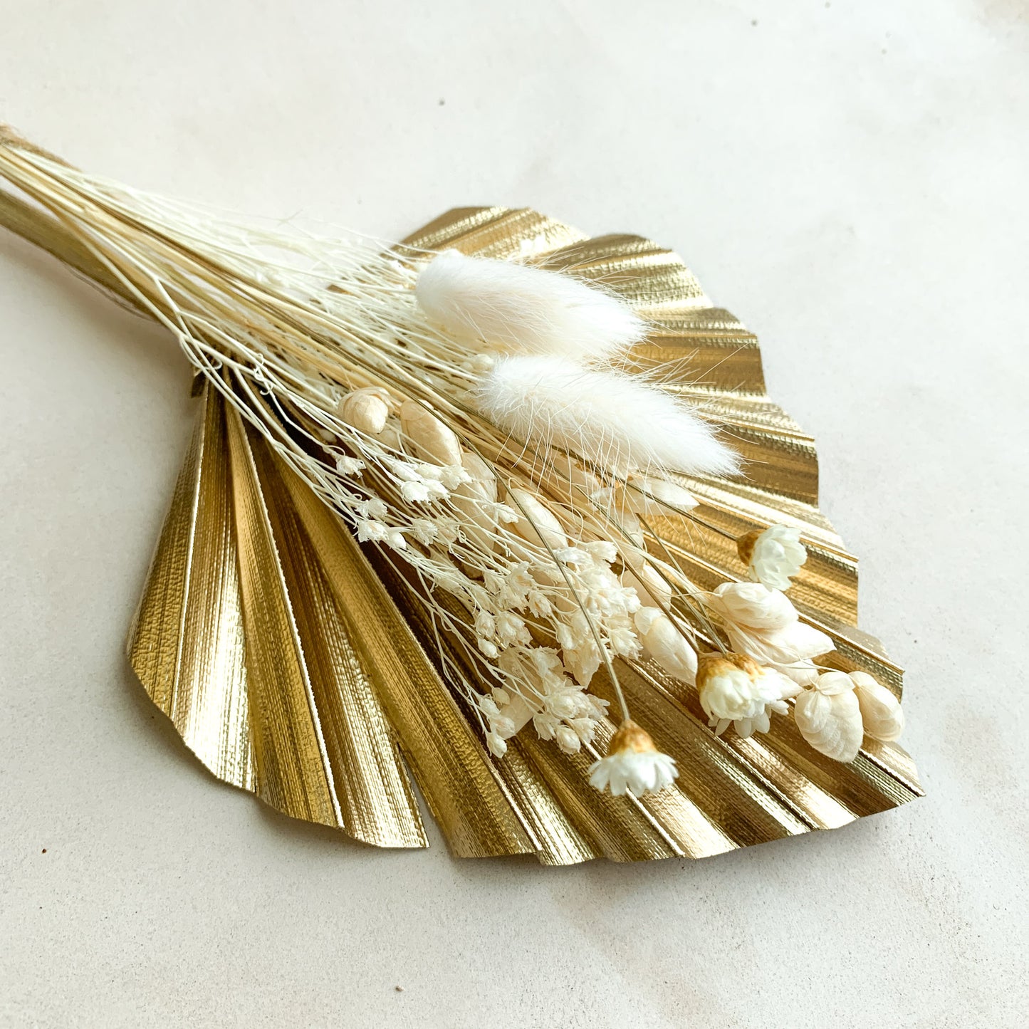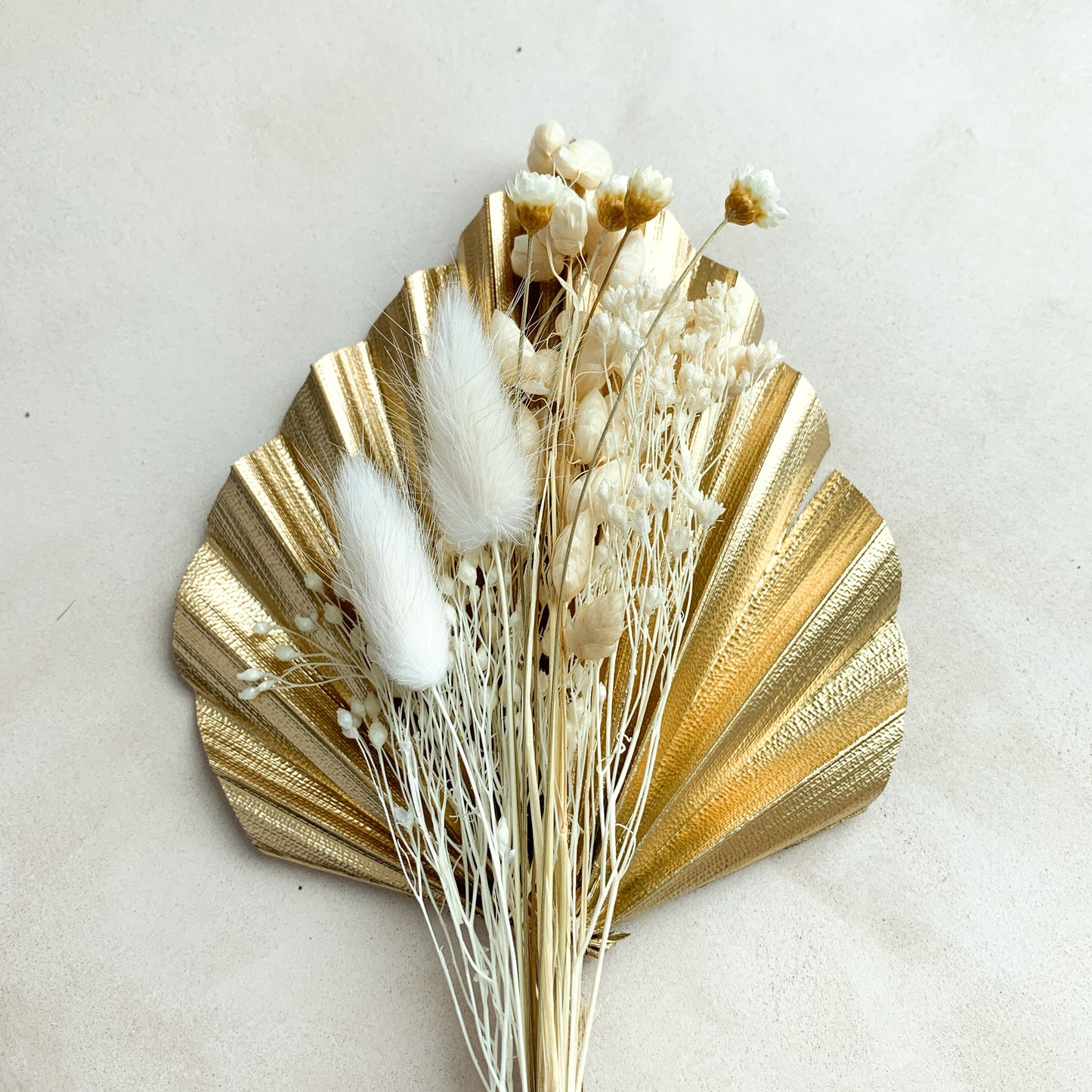 Contains 1 x gold palm spear and a cream/white grass mix.