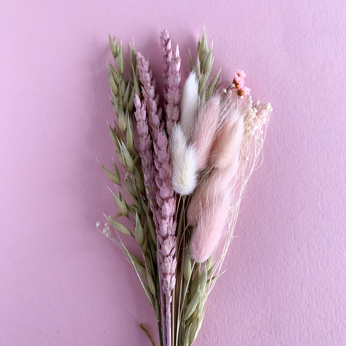Baby dried flower bunch filled with a mix of wheat, oats and bunny tails in pink, white and natural sage.