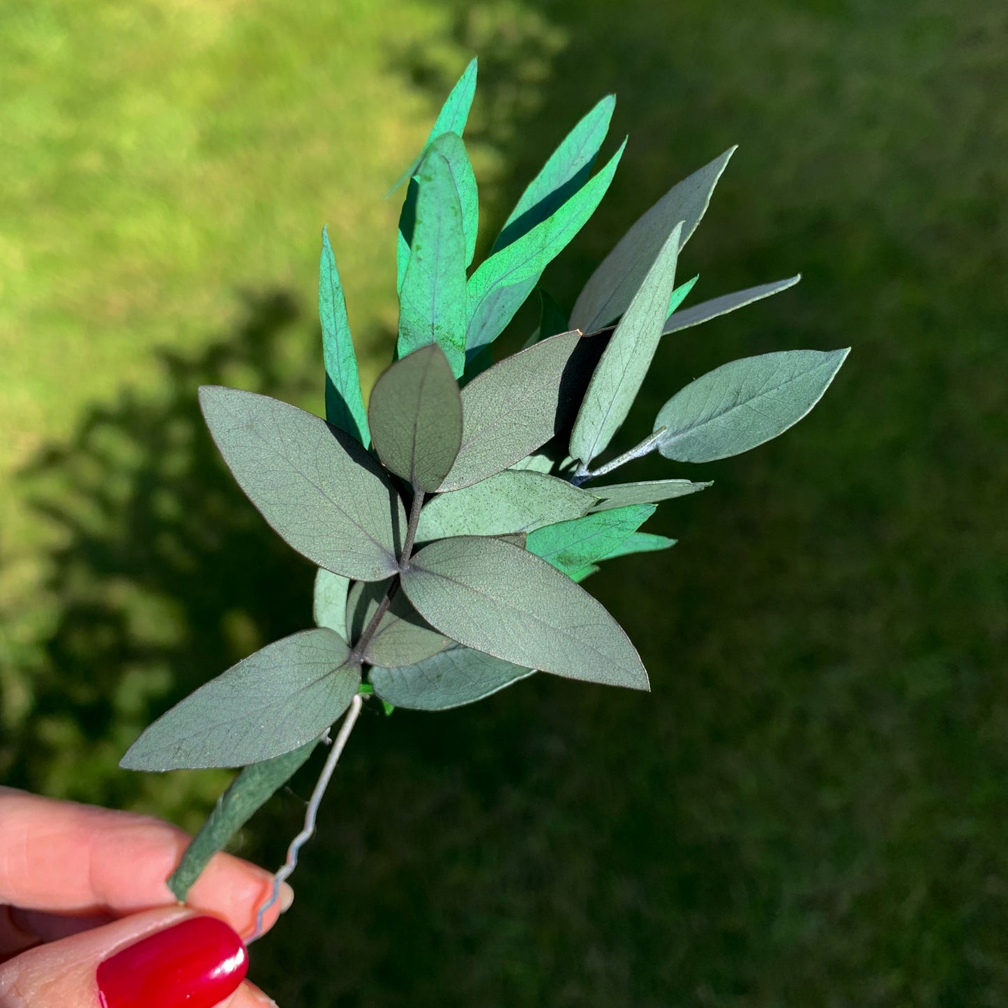 Preserved eucalyptus leaves set upon silver tone hair pins. If you're looking for a little bit of realistic looking foliage for your hair, then these are the hair pins for you.