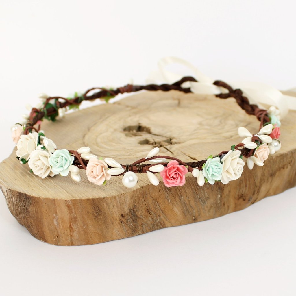 Handmade crown made on a rustic vine base, adorned with mulberry paper roses in ivory, mint, coral and pale peach. For a touch of glamour, ivory glass pearl beads are scattered through.