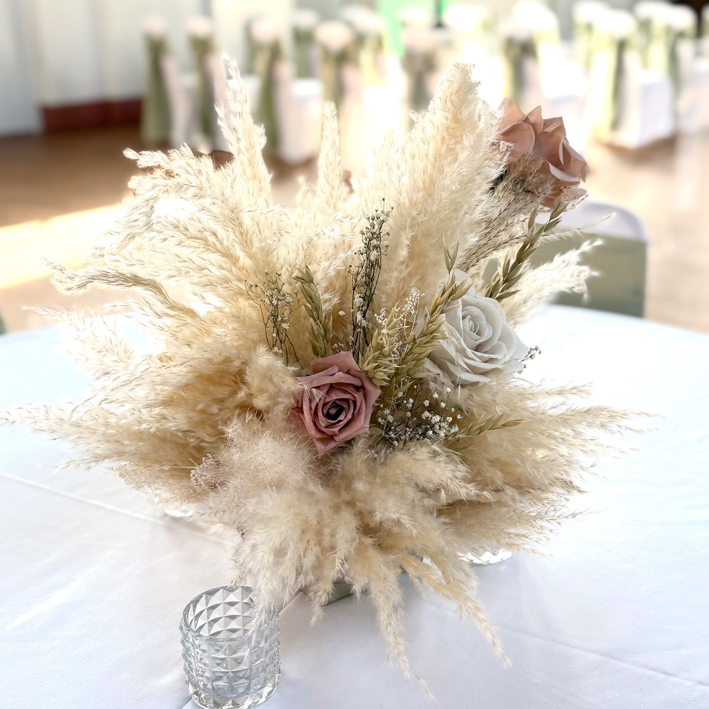 Transform your wedding day with our affordable pampas dried flower props. Our core range includes pampas plumes which are available as centrepieces, pedestals and top table decor.